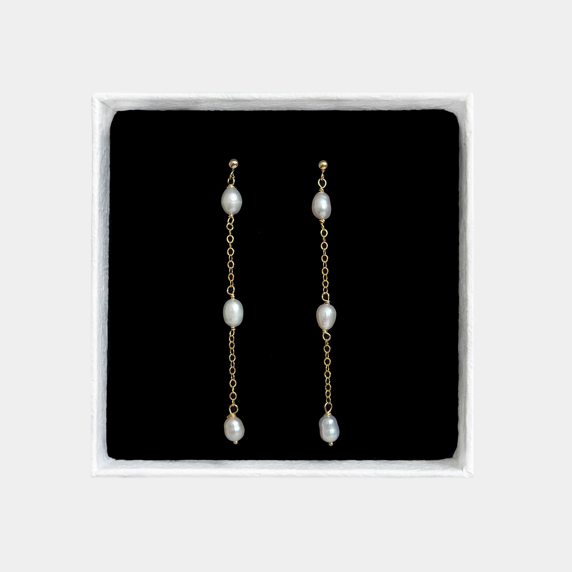 Die Elysian Drops Ohrringe bestehen aus goldfilled Ketten, verziert mit drei olivenförmigen Süßwasserperlen. Ihr elegantes und zeitloses Design macht sie zu einem perfekten Accessoire für jeden Anlass.