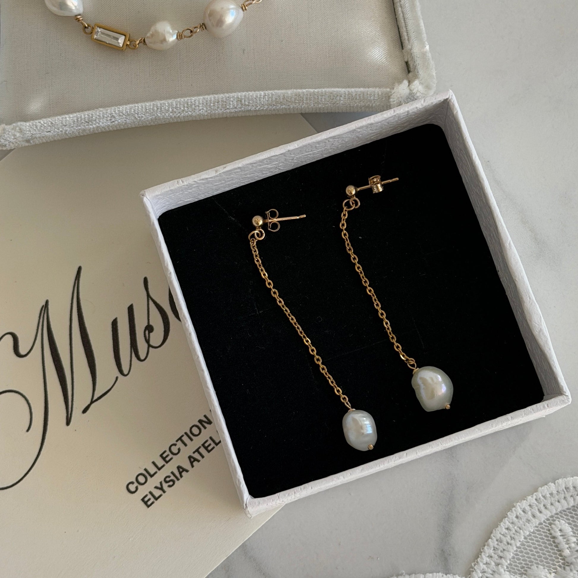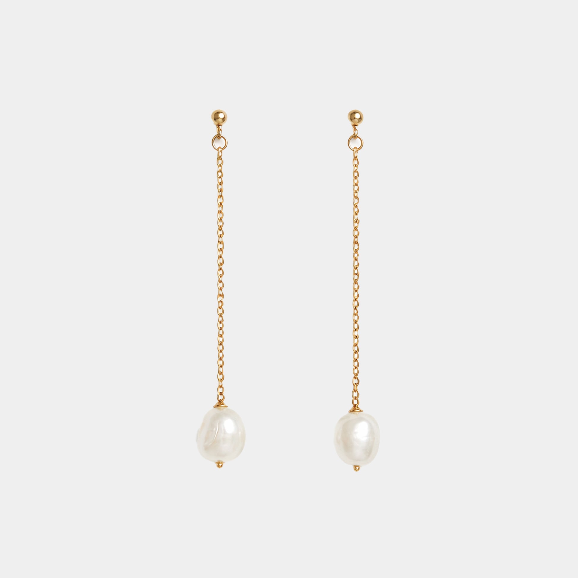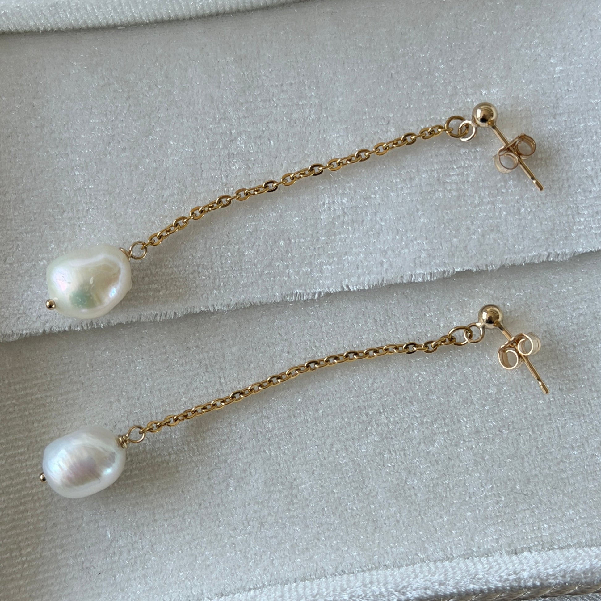 Handgefertigte Drop-Ohrringe aus Gold-filled und vergoldetem Edelstahl mit echten Süßwasserperlen.