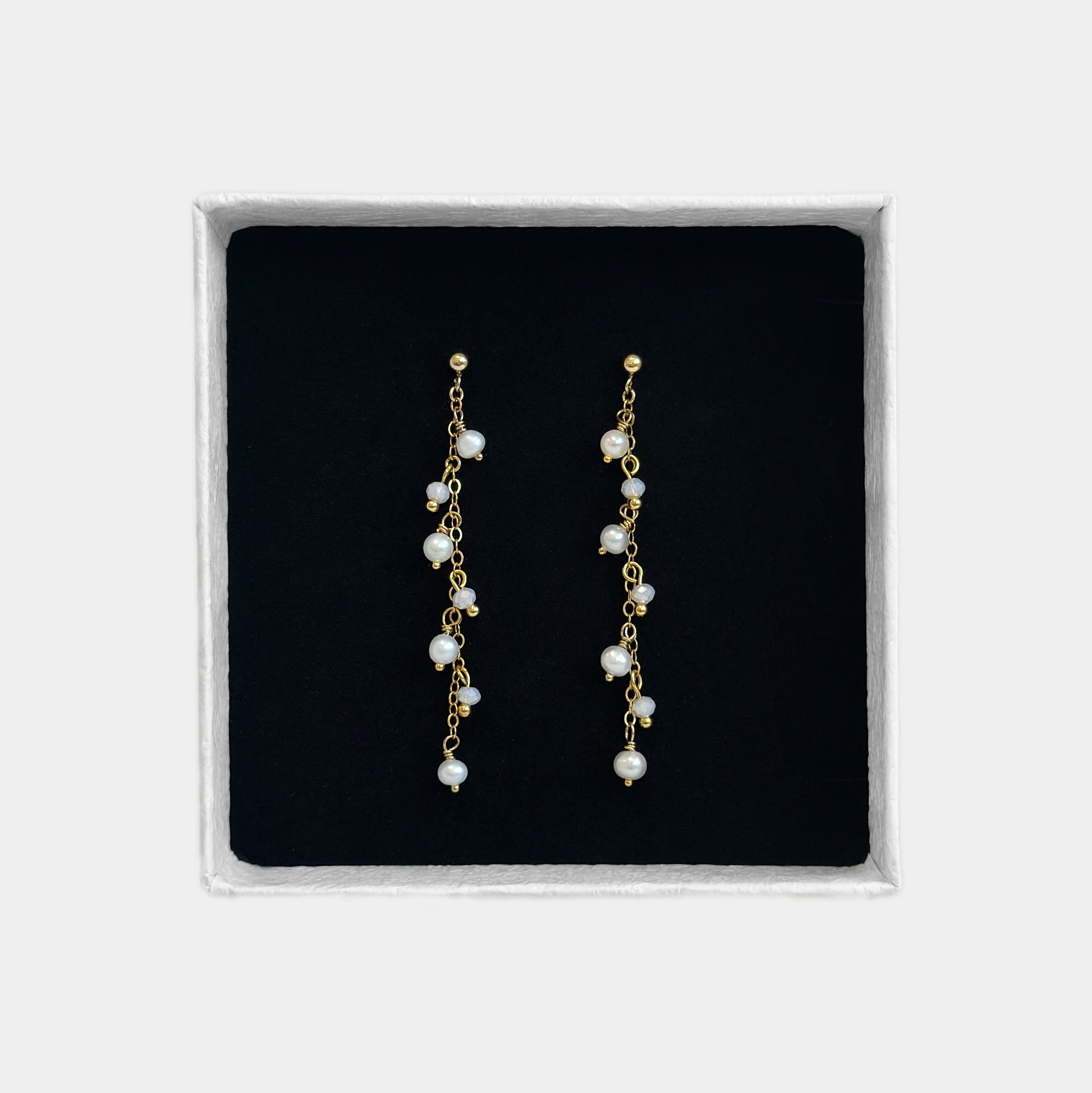 Inspiriert von Maiglöckchen – zarte Ketten, veredelt mit schimmernden Süßwasser- und Kristallperlen, die bei jeder Bewegung sanft mitschwingen und den eleganten Charakter der Ohrringe betonen.