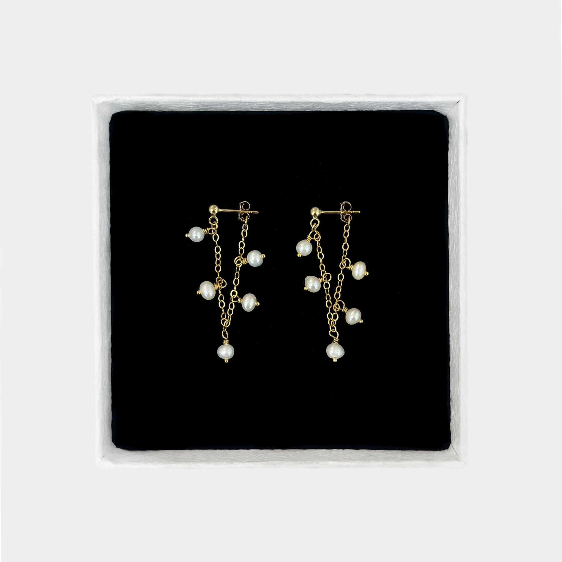 Die Mirelle Ohrringe verbinden modernes Design mit zeitloser Eleganz. Gefertigt aus 14k Gold Filled und verziert mit zarten Süßwasserperlen, zeichnen sie sich durch ihr besonderes Front-Back-Design aus: Die Ketten verlaufen von der Vorderseite des Ohrs bis nach hinten und lassen die Perlen sanft beidseitig schwingen.